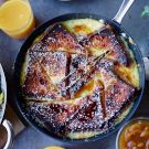Bake the brioche in the sauté pan until puffy and the edges of the bread on top are browned, about 1 hour. Drizzle the French toast with the marmalade and fruit syrup and serve immediately. Serves 4 to 6.