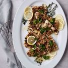 Season the fish on both sides with salt and pepper. Dip each fillet in the lemon-butter mixture to coat both sides, then arrange the fillets in the baking dish. Top each with an even coating of the walnut mixture, completely covering the top of each fillet. Transfer to the oven and broil until the fish just begins to flake when you press on it but is still translucent, 6 to 8 minutes; be careful not to overcook the fish.