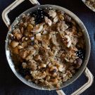 In the sauté pan over medium heat, add the apples and the 2 Tbs. brown sugar to the reserved brown butter. Cook until the apples are just beginning to soften, about 5 minutes. Remove from the heat and let cool slightly. Add the blackberries, lemon juice and cinnamon and toss to mix well. Spread the fruit evenly in the prepared baking dish or divide evenly among the cocottes.