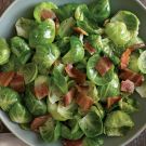 Crispy pieces of bacon lend a salty-savory note to this side dish, which uses only the leaves of the brussels sprouts. Be sure to cook the leaves just until they are bright green and tender; don’t overcook them.