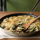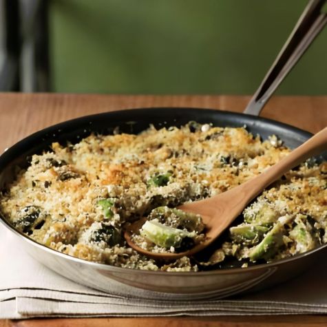 We’ve put a sophisticated new spin on a traditional Thanksgiving vegetable, transforming brussels sprouts into a creamy gratin. This dish offers an enticing contrast of flavors and textures: Caramelized shallots offset the slight bitterness of the brussels sprouts, while cream and two kinds of cheese add richness. A bread crumb topping lends irresistible buttery crunch.