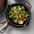In a 7-inch (18-cm) cast-iron skillet over medium-high heat, melt 1 Tbs. of the butter with 1 Tbs. of the olive oil, swirling to combine. When they are hot and sizzling, carefully add half of the brussels sprouts and cook, tossing frequently, until browned and softened, about 8 minutes. Transfer to a bowl.