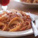 Guanciale, pork cheek that resembles unsmoked bacon and is cured with salt, pepper and sometimes garlic, is traditionally used in this dish from Amatrice, a small town near Rome known for its excellent pork products. Pancetta, rolled pork belly cured in a similar manner and more widely available outside Italy, can be substituted. Tomatoes, onion, garlic and chili complete the sauce, which is usually served over bucatini, a thick strand pasta with a hole in the center.