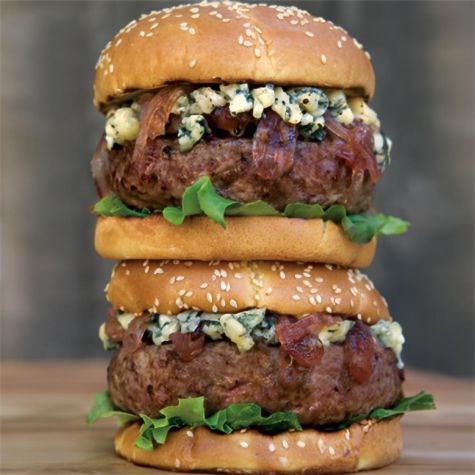 Serve the hamburgers on the grilled rolls topped with the blue cheese, lettuce, caramelized onion jam, ketchup and mustard. Serves 4.