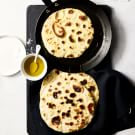 Inspired by Trinidadian buss up shut roti, this is a laminated style of roti, where the butter sandwiched between layers of dough melts and steams, puffing up pockets of air. The recipe pays homage to the Caribbean cultures found in the Bronx, like at Feroza’s Roti Shop, a favorite of Ghetto Gastro, a Bronx-based collective of chefs and food enthusiasts. The Ghetto Gastro team has discovered that a crepe pan makes the perfect tawa, or roti pan—the round iron griddle on which the bread is traditionally cooked.