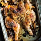 To serve, using clean poultry shears or a chef’s knife, cut the chicken into 10 serving pieces (2 legs, 2 thighs, 2 wings and 4 breast pieces). Transfer to a warmed serving platter and spoon the pan juices, including the garlic and lemon pieces, over the chicken. Serve immediately. Serves 4.