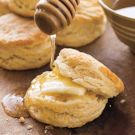 Turn out the dough onto a lightly floured work surface. Using a light touch, pat out the dough into a round 3/4 inch thick. Using a 2 1/2-inch round biscuit cutter or cookie cutter, cut out as many rounds as possible. Place them 1 inch apart on the baking sheet. Gather up the dough scraps, pat them out again, cut out more dough rounds, and add them to the baking sheet. Bake the biscuits until they have risen and are golden brown, 18 to 20 minutes. Serve hot with butter and honey, if desired. Makes 6 to 8 biscuits.