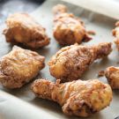 When the oil is ready, in batches to avoid crowding, carefully slip the chicken pieces into the hot oil. The temperature will drop, but adjust the heat to keep the oil bubbling steadily at about 325°F. Deep-fry the chicken pieces, turning them occasionally with tongs, until they are golden brown and show no sign of pink when pierced at the thickest part, about 12 minutes. Using a wire skimmer, transfer the chicken to the rack to drain. Repeat with the remaining chicken. Serve warm. Serves 4.
