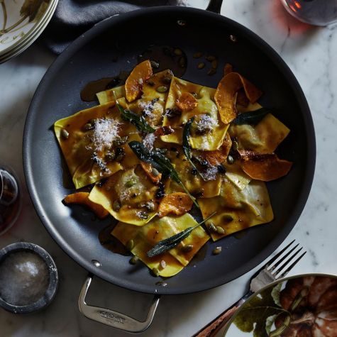 Drizzle the brown butter over the ravioli, then sprinkle evenly with the sage leaves and butternut squash slices. Garnish with pepitas and serve immediately, passing more cheese alongside. Serves 6.