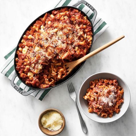 This flavor-packed pasta is made in collaboration with Ooni and chefs Thomas McNaughton and Ryan Pollnow of San Francisco’s popular Flour + Water Hospitality Group restaurants. In this recipe the chefs feature one of their favorite pasta shapes: campanelle. They make Flour + Water Foods' campanelle, which is available at select grocery stores nationwide, from just two ingredients—organic semolina flour and water—and cut the dough with artisanal bronze dies, which produce great texture and rough ridges on the pasta that grab sauces well. McNaughton and Pollnow toss the noodles with a punchy Calabrese sauce made with Calabrian chiles, anchovies and salametto piccante, a dry, spicy salami. Caciocavallo, a Southern Italian cheese with zesty, buttery flavors and earthy undertones, enriches the sauce; if it’s unavailable, provolone makes a fine substitute. Then the dish is quickly baked in an Ooni oven, where it cooks to cheesy, toasty perfection.