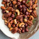 Slightly sweet and slightly spicy, these nuts are easy to prepare and make a satisfying snack when guests gather for dinner. You can toast the nuts up to 3 days in advance, but don’t toss with the rosemary leaves. Let cool, then place in an airtight container and store at room temperature. Just before serving, wrap the nuts in aluminum foil and warm in a 350°F oven. Toss with the rosemary leaves and serve.