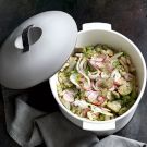 In this warm spring salad, an abundant mixture of vegetables is gently warmed in the oven before being topped with dill fronds and a sprinkling of aromatic fennel pollen. If you can’t find fresh fava beans (or don’t want to go to the trouble of prepping them), look for frozen, shelled fava beans at natural food markets and stores that carry Middle Eastern foods, then thaw them before adding them to the other vegetables. Alternatively, you could also substitute the same quantity of frozen shelled edamame.