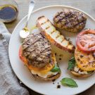 The fresh tastes of a caprese salad come together on this open-faced burger. If you haven’t worked with burrata before, you’re in for a treat. Like fresh mozzarella, this Italian cheese has a firm outer skin with a creamy, tangy interior. Letting the cheese come to room temperature for at least an hour before use will ensure it’s perfectly spreadable.