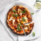 This summery pizza was inspired by the classic Italian salad known as caprese. It features tomatoes, fresh mozzarella and basil, reflecting the red, white and green colors of the Italian flag. The pie is baked in the blazing hot Ooni, an amazing oven that turns out Neapolitan-style pizzas with a beautifully crisp crust in about 1 minute. We include fresh mozzarella two ways: Pieces of cheese melt onto the pizza as it cooks, then just before serving, we top it with ciliegine mozzarella—cherry-sized balls of creamy cheese.