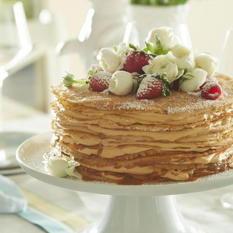 Popular in France, a gâteau mille crêpes (thousand-crepe cake) is traditionally made with a thin layer of pastry cream separating each crepe layer. Here, however, this stunning dessert gets a modern update by substituting homemade whipped caramel cream for the pastry cream