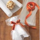 Wrap each popcorn ball in a square of parchment paper, place in a cellophane bag and tie a ribbon at the base of the ball. Makes 25 popcorn ghosts.