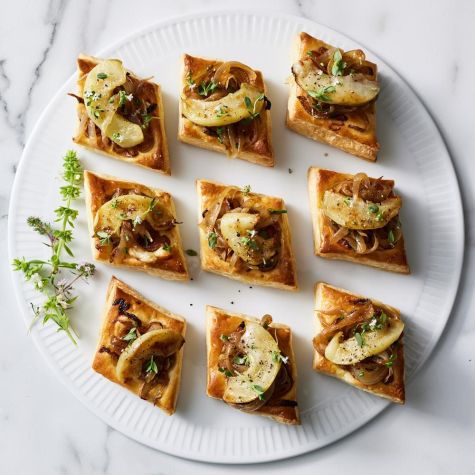 Every holiday celebration needs an easy and elegant appetizer to keep guests satisfied until the main event. This recipe from Chef Justine Kelly is just the thing: simple, pretty and delicious, with caramelized onions, apples and grated Gruyère cheese atop store-bought puff pastry.