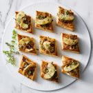 Cut the puff pastry into 2-inch (5-inch) squares or diamonds and place on the prepared baking sheets, spacing the squares about 1 inch (2.5 cm) apart. Brush the pastry squares with the egg mixture and place a heaping 1 Tbs. topping in the center of each square. Season with salt and pepper.