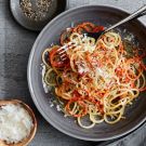A classic Roman dish of pasta served simply with pecorino romano cheese and plenty of freshly ground black pepper, cacio e pepe takes a turn for the lighter and healthier when you substitute carrot and parsnip “noodles” for the traditional spaghetti or vermicelli. And since a spiralizer makes quick work of cutting the vegetables into strands, you can easily cook this simple vegetarian dish any night of the week.