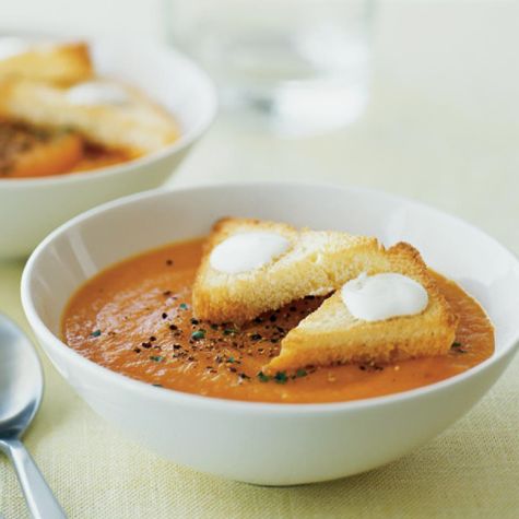 Spoon the crème fraîche on each toast triangle, dividing it evenly. Ladle the soup into warmed bowls and float 2 toasts on each serving. Serve immediately. Serves 4.
