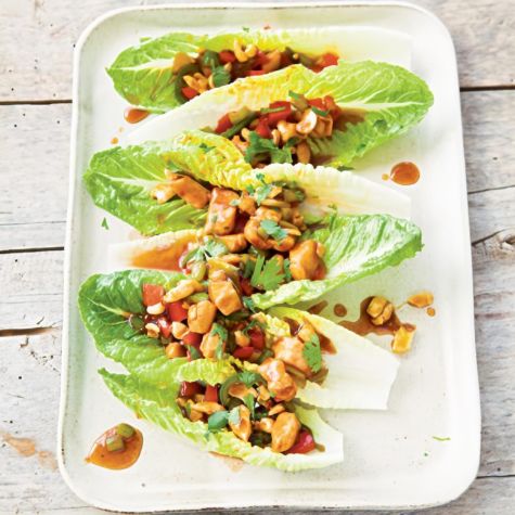This playful spin on tacos starts with a savory Asian-style chicken-and-vegetable stir-fry, then uses crisp, fresh romaine lettuce as a stand-in for tortillas. Chopped cashew nuts add healthy crunch and cilantro lends freshness.