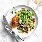 Inspired by cassoulet, the comforting dish from the South of France, we’ve created a lighter (and easier) version that’s perfect for spring. In its traditional form, cassoulet is a slow-simmered stew chock-full of tender beans and several types of meats, such as duck, sausage and pork. It’s also time-consuming to prepare. Our streamlined recipe keeps the beans—and the comfort factor—but swaps out the rich meats for crispy chicken thighs, which are served on the side. To boost the flavor of the beans, we stir in a bright-tasting pesto made with lots of fresh herbs and greens; just whirl everything together in a food processor. Then we finish the cassoulet with a sprinkling of garlicky bread crumbs and grated Parmesan. Round out the meal with grilled zucchini if you like.