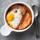Crack the eggs into the soup, sprinkling a little salt on each one. Transfer the dish to the oven and bake until the eggs are just cooked, 10 to 15 minutes. Serve piping hot. Serves 6.