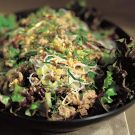 Line a platter with the lettuce leaves. Top with the pork and noodles, garnish with the peanuts, mint and cilantro and serve. Serves 4.