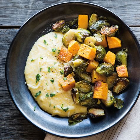 Meanwhile, pile the squash and brussels sprouts on a baking sheet lined with parchment paper. Drizzle with the olive oil and balsamic vinegar, season well with salt and pepper, and toss to coat. Spread the vegetables into a single layer and roast, stirring once about halfway through, until fork-tender and golden brown, 20 to 25 minutes. Remove from the oven and set aside while you finish the polenta.