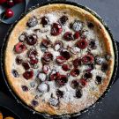 Clafoutis (pronounced "kla-foo-TEE") is a rustic French dessert originally from Limousin, in southern France. This region is best known for its sweet black cherries, which, left whole and unpitted, are traditionally baked in a sweet custard filling. Purists insist the pits help to perfume the dish with an appetizing scent, but you can use pitted fruit if you prefer. Preparation is fast and easy, so the dessert is a perfect choice for impromptu gatherings.