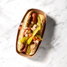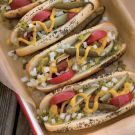 Choose your dogs wisely. All-beef or all-pork hot dogs, or a combination of beef and pork, are the standard. Look for dogs in natural casings, which give the distinctive “snap” and mouthfeel of a properly prepared hot dog. Although Chicago-style hot dogs are often steamed, our riff on this classic comfort food involves cooking the dogs on a grill and serving them with buttered, lightly toasted buns.