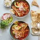 Ladle into bowls. Garnish with the tortilla chips, queso fresco, avocado, cilantro and radishes, and serve immediately. Serves 4 to 6.