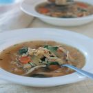 Add the pasta to the simmering soup and cook until the pasta is al dente, 3 to 4 minutes, or according to the package instructions. Add the spinach and chicken and cook, stirring, until the spinach has wilted and the chicken is warmed through, about 1 minute. Season with salt and pepper.