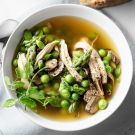 Strain the stock, return it to the pot, and season with salt and pepper. Bring the stock to a simmer and add the chicken, mushrooms, asparagus and peas. Simmer for 2 to 3 minutes. Adjust the seasoning with salt and pepper. Ladle the soup into warmed bowls and serve immediately. Serves 4 to 6.