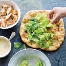 While the piadine are baking, assemble the salad: In a large bowl, toss the lettuce with the Caesar dressing, the remaining 3 Tbs. Parmesan and the chicken. Top each of the piadine with the chicken salad, dividing it evenly, and serve immediately. Serves 4.