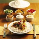 The classic flavors of India come to the table in this simple chicken curry, which is served with an array of condiments. Accompany with steamed rice, which will absorb the delicious sauce. For a less rich, lower-calorie version of the curry, substitute an additional 1 1/2 cups chicken stock for the coconut milk.
