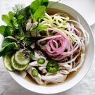 Add the shredded chicken, spiralized vegetables and soy sauce to the broth and stir to combine. Cook just until the vegetables are warmed through, about 2 minutes. Serve immediately with mint, lime wedges and the remaining jalapeño slices alongside. Serves 6.