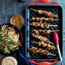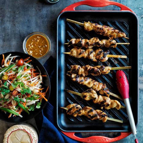 Place the skewers on the grill pan and cook, turning once, until grill marked on the outside and opaque throughout, 6 to 8 minutes total. Meanwhile, pour the peanut sauce remaining in the jar into a serving dish. Serve the chicken hot, with the peanut sauce alongside for dipping. Serves 4.