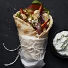 In our spin on Middle Eastern shawarma, we wrap grilled chicken, sweet potato fries, crisp vegetables and tangy feta cheese in toasted pita bread to create a handheld meal that will satisfy kids and adults alike. The Philips air fryer makes fast (and light) work of cooking the fries using minimal oil. Labneh, a thick strained yogurt with a rich, creamy texture, is combined with shredded cucumber and fresh dill to make a sauce that’s spread on the pita and also used for dipping. If you can’t find labneh, Greek yogurt makes a fine substitute.