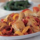 When the chicken is done, mix the peppers and the pan juices into the chicken, reduce the heat to low and cook gently for 5 minutes to blend the flavors. Transfer the chicken and peppers to a warmed platter and serve immediately. Serves 4.