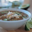 Add the shredded chicken, reduce the heat to medium and simmer until the chicken is heated through, about 3 minutes. Add the lime juice to taste and season with salt. Ladle the soup into warmed bowls, garnish with the tortilla chips, queso fresco, avocado and cilantro and serve immediately. Serves 4 to 6.