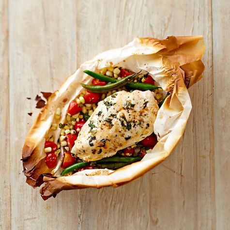 This quick-cooking dish combines chicken with a trio of favorite summer vegetables: fresh corn, cherry tomatoes and green beans. The recipe was developed for a Cuisinart steam oven. To use a conventional oven, prepare the parchment packets as directed below and place on a baking sheet. Bake in a preheated 400°F oven until the chicken is cooked through and the vegetables are tender, 20 to 25 minutes.