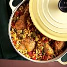 This is our version of arroz con pollo, the traditional Spanish dish of chicken and rice that is seasoned with saffon. The ingredients are simmered together to enhance the flavors, creating the perfect one-pot meal.