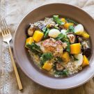 Braising chicken with vegetables and herbs is a great way of getting ingredients to mingle and form something more delicious than the sum of their parts. Here, squash, turnips and mushrooms add deep flavor to chicken thighs. Serve over brown rice to absorb the savory juices.