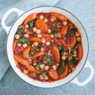 Add the tomatoes and chickpeas and bring to a simmer. Cook, stirring occasionally, until the carrots are tender and the sauce has thickened a bit, 15 minutes. Add the spinach and simmer until wilted, 5 minutes.