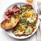 Wake up your bacon and eggs with this fun twist on the classic duo. The eggs are fried in a mixture of melted butter, chili crisp and grated Parmesan. The chili crisp adds umami and mild heat, while the Parm lends salty-savoriness. Our Test Kitchen chefs use this genius trick when cooking the bacon—they start the slices in a cold fry pan on the stovetop to slowly render the fat. As the pan heats up, the fat begins to melt and the bacon will cook through, becoming as crisp as you like it. To round out the meal, serve the eggs over toast, polenta or steamed rice. This dish is guaranteed to jump-start your morning and also makes a cozy breakfast for dinner.