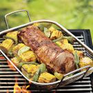 Place the pork on the grill over direct heat and sear until grill-marked on all sides, 7 to 8 minutes total. Transfer the roast, tied side down, to the center of a mesh roasting pan and set over indirect heat. Cover the grill and cook for 30 minutes, maintaining the internal temperature of the grill at 400° to 425°F.
