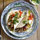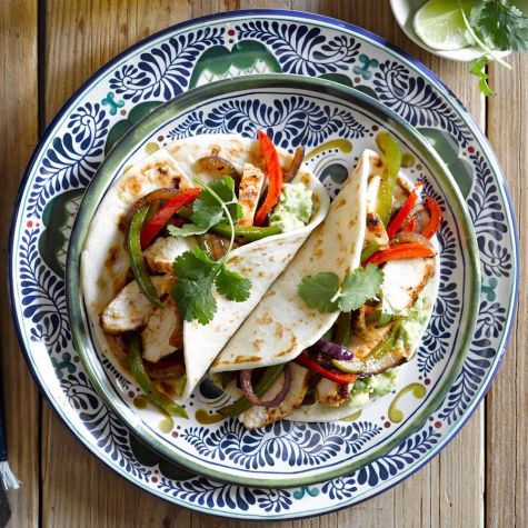 Serve the chicken, onion and bell peppers with the tortillas, cheese, salsa, cilantro and lime wedges, allowing diners to assemble their own fajitas at the table. Serves 4.