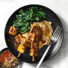 Shawarma Spice Tofu Skewers with Hummus and Wilted Spinach