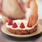 Using a large spoon, mound the whipped cream on top of the cake and spread evenly. Place 10 strawberries around the rim and 1 in the center. Serves 10.